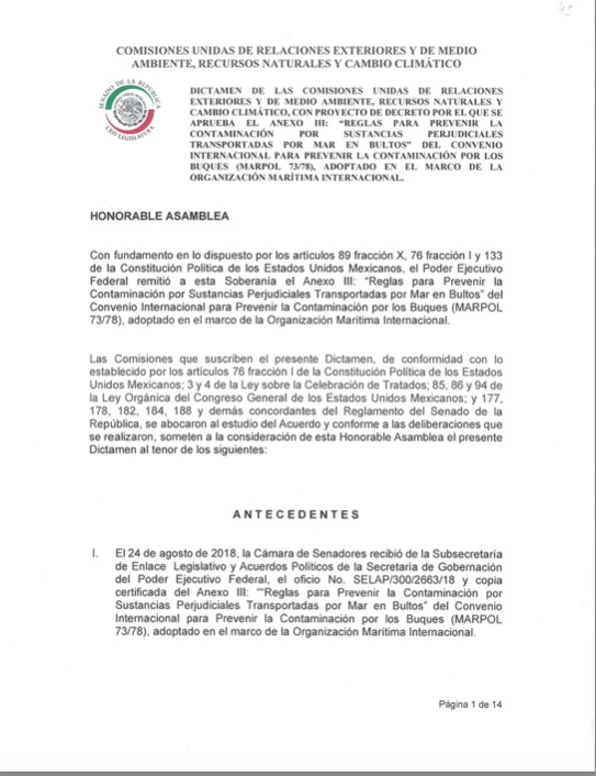 El Marpol, para conocimiento de usted, es el mayor instrumento para prevenir la contaminación ocasionada por las mercancías que se transportan por mar y consta de 6 anexos técnicos, cuatro de ellos opcionales o protestativos, el III, IV V y VI. Se pretende abarcar todas las circunstancias que puedan provocar contaminación en el mar. De estos, México solo se había adherido al I sobre daños ocasionados por hidrocarburos y II sustancias químicas que son automáticos al firmar el Marpol y al V que regula las basuras y desechos plásticos que son lanzados al mar.Le quedarían pendientes solo el IV, aguas grises y el VI ya citado pero eso significaría prohibir a nivel nacional el combustóleo marino.