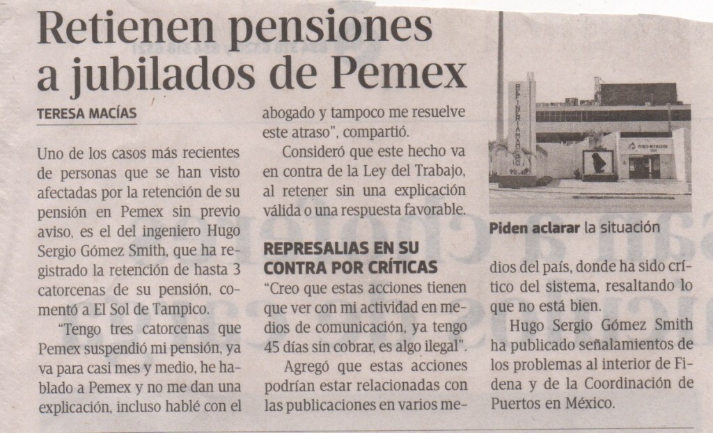 Mire caro lector al momento de escribir la presente 26 de noviembre del 2021 tengo ya tres catorcenas que Pemex ha retenido mi pensión jubilatoria. Por mas que he pedido una explicación los funcionarios a cargo de este tema en la Terminal Marítima de Madero me señalan que no hay explicación; que posiblemente es el banco que está dando de baja cuentas antiguas; y mas pretextos. Pero mire yo tengo otras explicaciones a las que he querido acudir solo como un último argumento: existe la posibilidad de que en los círculos de poder se haya molestado por la postura crítica, tanto a hechos como a actos que van en contra del país. Y para llevar a cabo actos de represión no es necesario que sea directamente bajo instrucción expresa. Por experiencia sabemos que para un funcionario de alto nivel no es necesario dar una orden directa. Sobran y basta un señalamiento en las mañanas para cargar con el estigma y direccionar acciones en contra de la prensa. Con una mano se acaricia a los pobres y con la otra se golpea a los opositores. No hay duda.