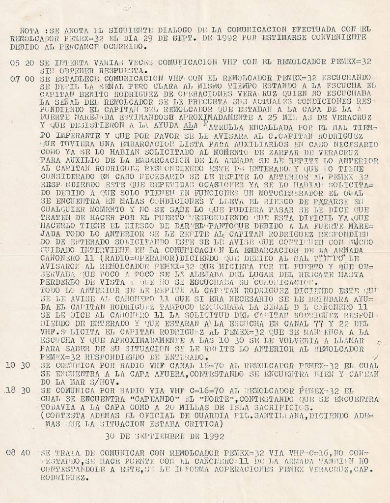 La fatalidad empieza a tejer su trama allá a mediados de septiembre de 1992 en la línea que separa el verano del otoño, después del día 25, cuando el remolcador PEMEX 32 que dependía de Coatzacoalcos salió para apoyar una patrulla de la Armada de México que yacía varada sobre los bajos de Antón Lizardo, frente al puerto de Veracruz Durante varios días la nave se mantuvo en la ruda maniobra hasta que desistió ya que los fuertes vientos del norte le obligaron a entrar a puerto. Una vez que el viento amainó, el capitán Alberto Reyes Pérez El Tiburón, como se le conocía en toda la flota petrolera, se hizo a la mar de nuevo y retomó la maniobra .Dicen que el Norte recobró su fuerza, por lo que todas la patrullas de la Armada de México regresaron a Veracruz. Él se quedó a capotear el mal tiempo. Tomó como referencia que en Tampico ya había bajado su fuerza. Datos tomados de la última comunicación que sostuvo el remolcador con el capitán del Buque Tanque Vicente Guerrero, Samuel Aguilar que servía de enlace con la jefatura de operaciones, indican que estaba fallando un generador y que aún con la orden de entrar a puerto se quedó en el mar considerándolo menos riesgoso debido a que si viraba el rumbo la fuerte marejada podía hundir la embarcación.